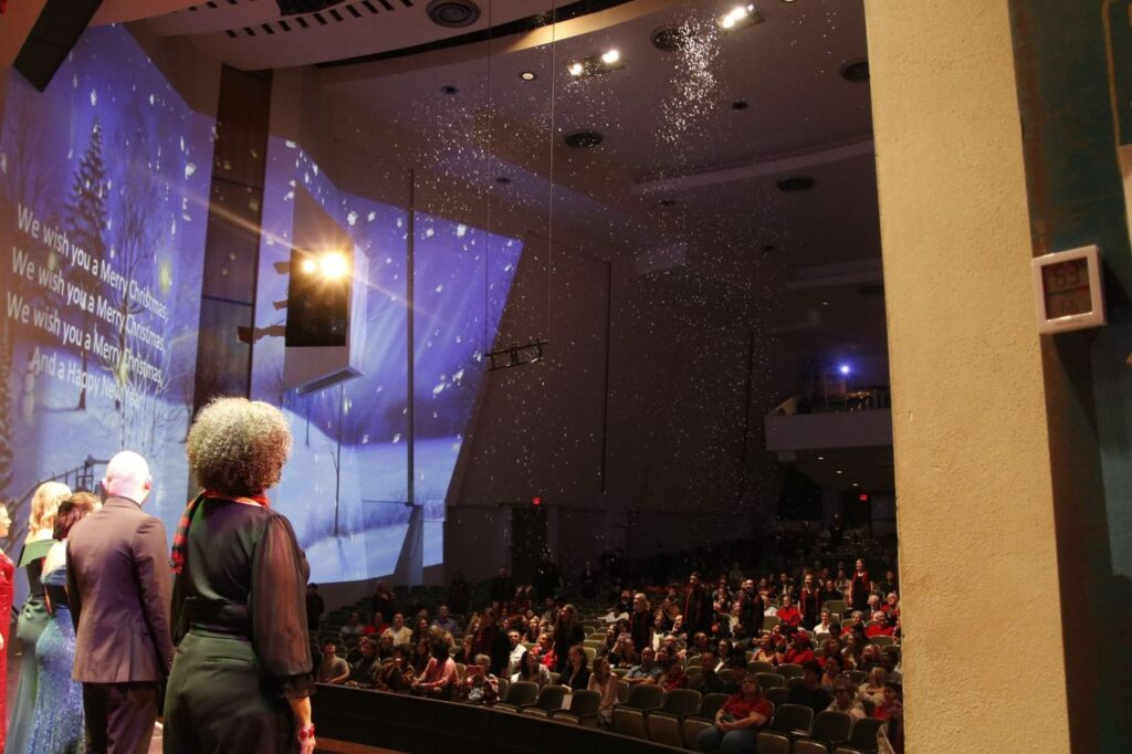 Each song in the concert featured its own personalized projection to accommodate the lyrics or the message of the piece, and to close out the performance, audiences were showered with bubbly fake “snowflakes” from the ceiling as they rang in the yearly concert closer– the Christmas carol sing-a-long.